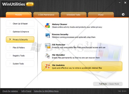 - Buka dan Jalankan WinUtilities Professional Edition 10, Lihat pada bagian Privacy & Security, lalu klik modul "File Undelete".